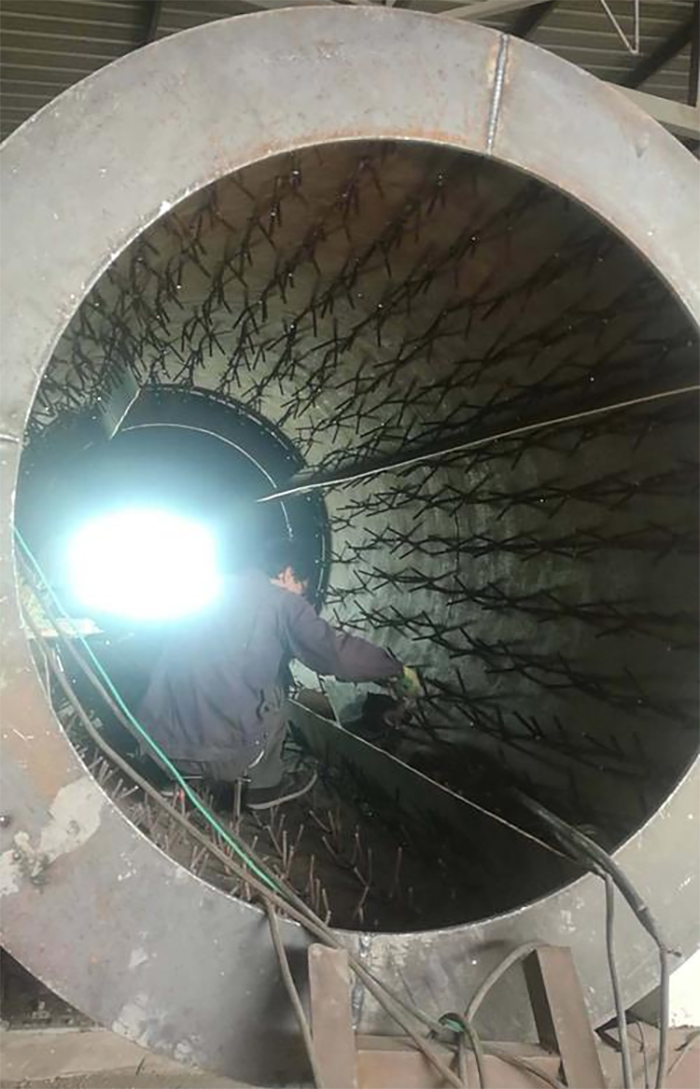 另外,部分回轉(zhuǎn)窯采用輕質(zhì)澆注料或者纖維板等作為隔材料,工作層采用重質(zhì)澆注料(金屬抓釘錨固)雙層澆注結(jié)構(gòu),可以合理控制回轉(zhuǎn)窯外壁溫度。該結(jié)構(gòu)采用金屬件把耐火材料和筒體連為一體,不存在耐火磚脫落問(wèn)題,但是金屬件焊接質(zhì)量和澆注料中水份烘干排出是關(guān)鍵。