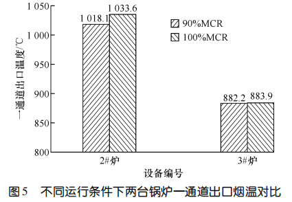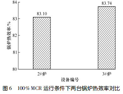 兩臺(tái)設(shè)備運(yùn)行 11 個(gè)月后進(jìn)行了能效測試。圖5對(duì)比了 90%鍋爐大的連續(xù)蒸發(fā)量(簡稱 MCR)和MCR 條件下鍋爐一通道的出口煙溫。圖6示出了MCR運(yùn)行條件下兩臺(tái)鍋爐熱效率的對(duì)比。結(jié)果顯示:在 90%MCR 運(yùn)行條件下,3#爐一通道出口煙溫比2#爐低 135.9 ℃,在MCR 運(yùn)行條件下,3#爐一通道出口煙溫比 2#爐低 149.7 ℃,3#爐的熱效率比 2#爐高 0.64%。相較而言,使用膜式壁爐襯的3#爐在負(fù)荷相當(dāng)?shù)那闆r下,余熱鍋爐熱效率更高。