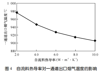 SiC 自流料熱導(dǎo)率對(duì)一通道出口煙氣溫度的影響圖4示出了自流料熱導(dǎo)率對(duì)一通道出口煙氣溫度的影響??梢钥闯?,爐襯各工作層厚度固定時(shí),一通道出口煙氣溫度隨自流料熱導(dǎo)率的升高而降低。通過調(diào)整自流料熱導(dǎo)率,一通道出口煙氣溫度差值高達(dá) 70 ℃。