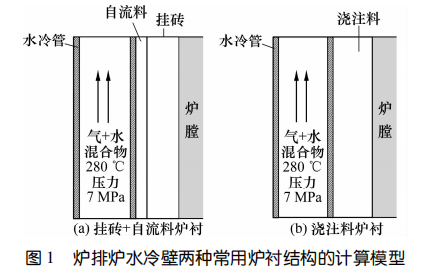 國內(nèi)外爐排爐在水冷壁內(nèi)襯結(jié)構(gòu)設(shè)計(jì)上有較大差別,國外爐排爐水冷壁內(nèi)襯結(jié)構(gòu)為鰭片(扁鋼)掛釘+SiC掛磚+SiC自流料填充密封,簡稱膜式壁結(jié)構(gòu);國內(nèi)則為水冷管錨固釘+SiC澆注料結(jié)構(gòu)。不同的爐襯材質(zhì)和結(jié)構(gòu)對(duì)水冷壁內(nèi)襯傳熱有較大影響,目前尚未見爐排爐水冷壁內(nèi)襯熱傳導(dǎo)研究報(bào)道。
