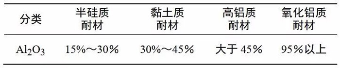 Al?O?-SiO?系耐火材料的基本化學(xué)組成是氧化鋁和二氧化硅,依照氧化鋁含量的高低,將硅鋁系耐火材料劃分為表1幾類(lèi)。
