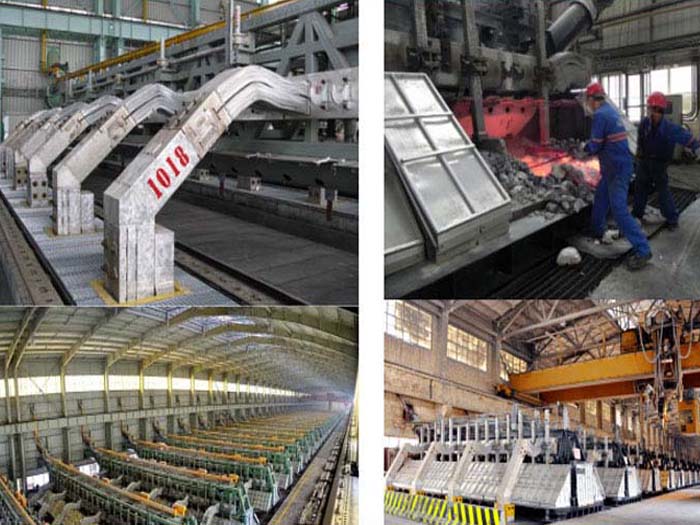 鋁電解槽通常為矩形鋼殼,內(nèi)襯碳磚。電解槽中懸有一碳陽(yáng)ji,其碳質(zhì)槽底為陰ji。電解還原出來(lái)的金屬鋁熔體沉積于槽底陰ji。陽(yáng)ji放出的氧與碳陽(yáng)ji反應(yīng)生成CO與CO2。槽內(nèi)電解質(zhì)與鋁保持熔融狀態(tài),隔一定時(shí)間從槽內(nèi)放出鋁液,并向槽內(nèi)加入一定量的Al2O3與冰晶石(3NaF.AlF3)等。電解溫度為900~1000℃。